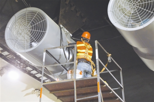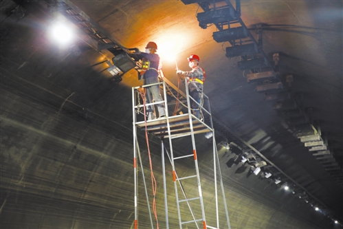 11月1日是隧道整治施工的第四天,工地現(xiàn)場(chǎng),多個(gè)作業(yè)面同時(shí)鋪開(kāi),施工人員三五個(gè)一組共近60來(lái)人,有序分工,緊鑼密鼓地開(kāi)展各項(xiàng)作業(yè)。施工現(xiàn)場(chǎng),有的站在活動(dòng)腳手架上安裝燈具,有的在布管線、接線調(diào)試,有的在安裝風(fēng)機(jī)……一項(xiàng)工序銜接著另一項(xiàng)工序,各個(gè)工種環(huán)環(huán)相扣。截止當(dāng)晚10點(diǎn)30分,隧道內(nèi)燈具、風(fēng)機(jī)全部安裝完畢,黃土嶺隧道群整治已完成總工程量的60%。