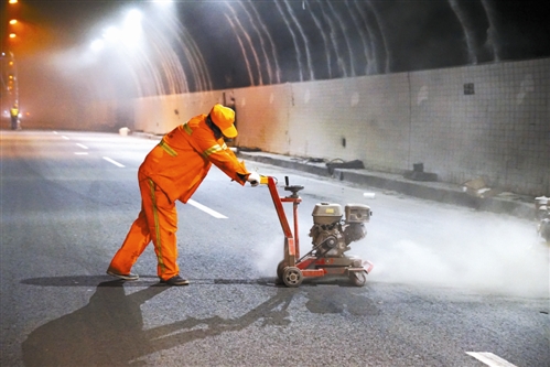 走進(jìn)隧道,一股冷風(fēng)侵襲,洞內(nèi)風(fēng)大又潮。來(lái)自湖北的游師傅,負(fù)責(zé)噴隧道墻面乳膠漆。他有著20多年的豐富經(jīng)驗(yàn),在施工現(xiàn)場(chǎng),他頭戴安全帽,身穿反光背心,緊系安全繩,一個(gè)人站在高高的架子上,底下4名工人不時(shí)緩緩地推動(dòng)登高架。游師傅全然不顧洞內(nèi)的濕冷,大手一揮,熟練而均勻地噴灑著油漆,沒(méi)多久墻面便嶄新一片。
