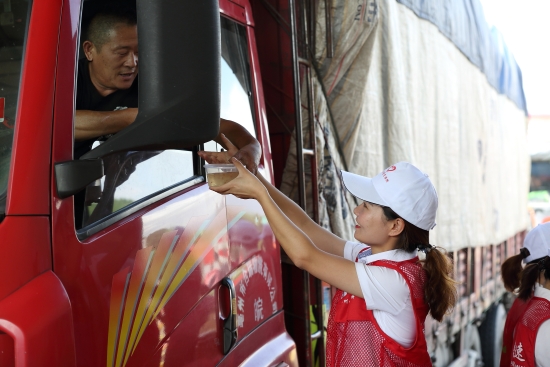 圖為志愿者給司乘遞上飲品 在送清涼的同時,志愿者們還溫馨提醒司機朋友們不要疲勞駕駛,高溫天氣中注意行車安全,并為不熟悉路況的司乘指引路線。此外,工作人員還在“便民小藥箱”中補充了防暑等應急藥品,以應對高溫中暑等突發狀況。 一杯杯清涼的飲品,幾句簡短而溫馨的交流,拉進了志愿者們與司乘人員之間的距離,司乘人員的好評將整個活動現場推向高潮。 該所共計送出200多份清涼飲品,受到廣大司乘人員的一致好評。大家用實際行動傳遞文明,延伸了服務的同時,更展示出臺州高速人的良好形象。 楊雅芬