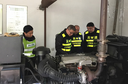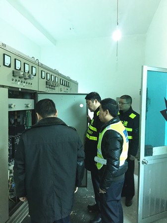圖為檢查員在檢查配電房用電設備 檢查人員本著“防范在先、警惕在前”的原則,重點檢查了供配電房的供電設備運行狀況和消防設施。在供配電房,大家對環境衛生、發電機組的機油油位、電柴油儲備量、水箱水位等逐一進行檢查,并當場啟動發電機組,查看是否能夠有效運行,并仔細檢查了消防設施生產日期、日常巡查記錄,消防水池儲存水量是否充足等,確保能夠正常使用。
