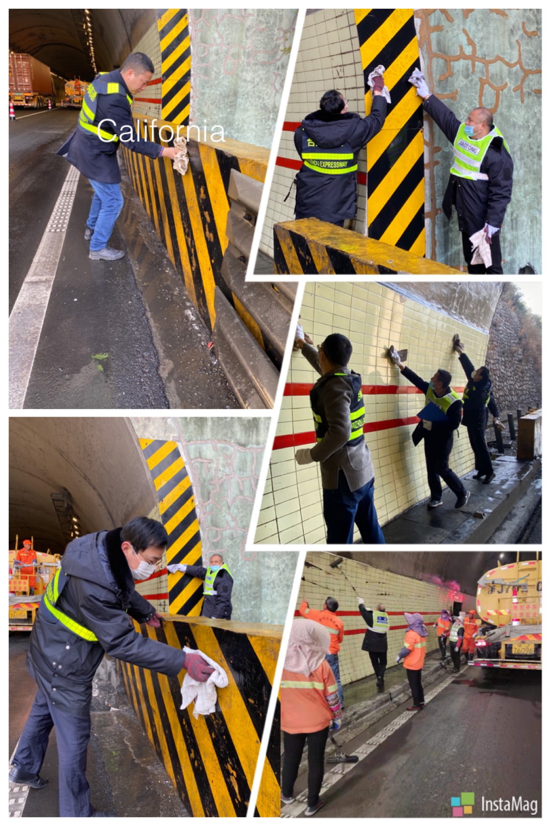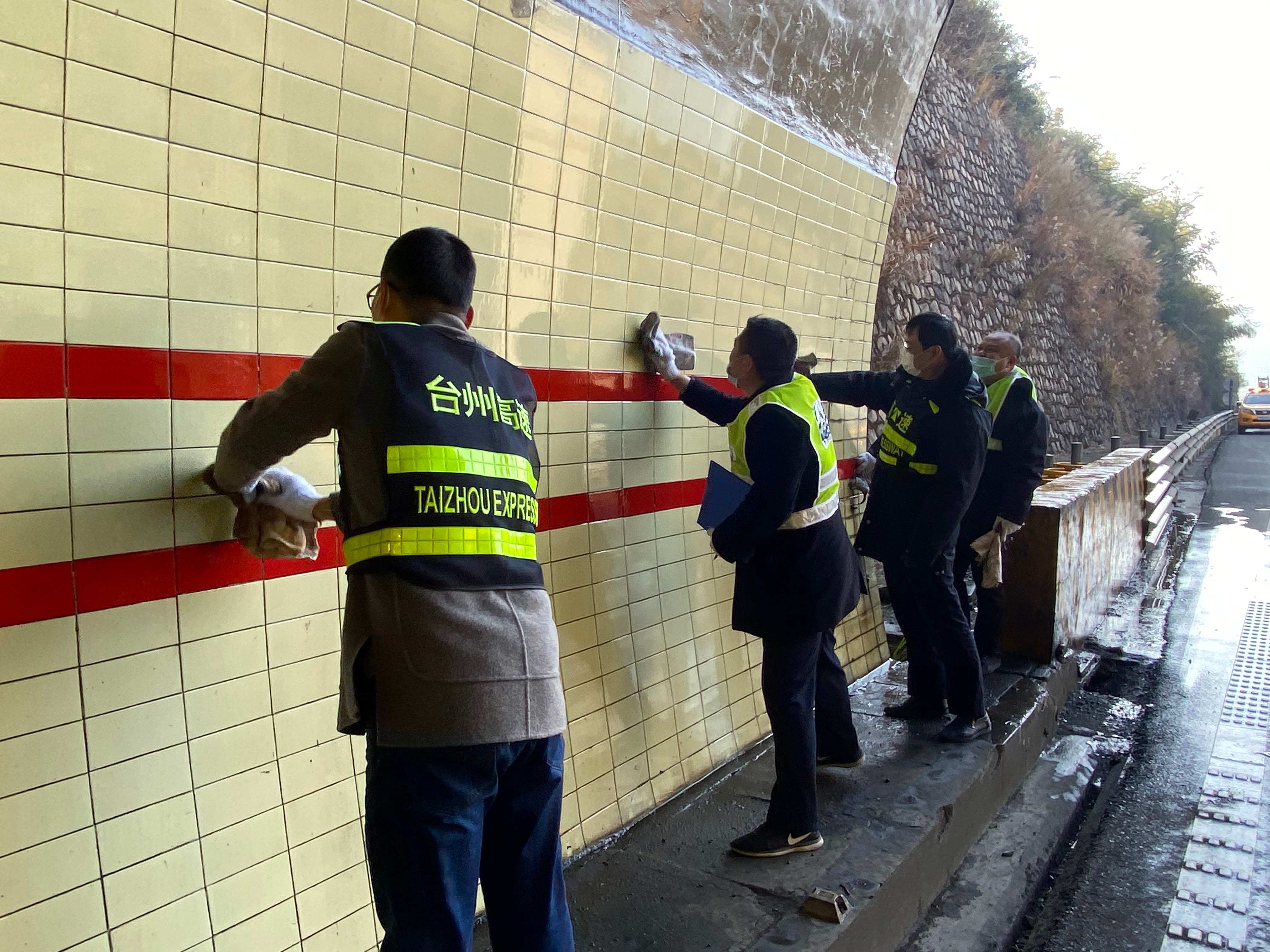 “洞口反光標牌再擦擦,這瓷磚用拖把搓一搓!” “隧道經擦洗顯得更亮堂了。”