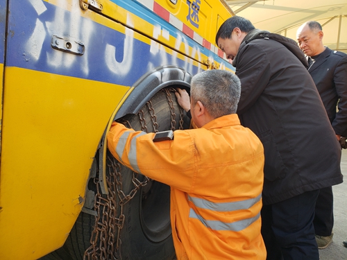 圖為演練現(xiàn)場 據(jù)施救中心隊(duì)員王凱介紹,施救車輛輪胎直徑達(dá)1.2米,一條防滑鏈重40斤,一輛施救車需要捆綁兩條防滑鏈。 操作期間,盡管防滑鏈與輪胎型號(hào)已經(jīng)相匹配,但巨大的輪胎影響了操作人員的視野,沉重的防滑鏈也給操作帶來了一定的困難,一時(shí)之間,防滑鏈拉上去又掉下來,始終不能與輪胎完美嵌合。眼下雖然正值寒冬,但是在捆綁防滑鏈的過程中,大家的額頭還是出了不少汗。