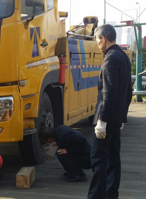 圖為施救現(xiàn)場 為了應對隨時可能出現(xiàn)的救援情況,中心領導發(fā)動人員兵分三路,火速進行離合器片的更換修理。機動人員聯(lián)系附近的4 S店,講明情況,可是沒有該種型號的離合器片,值班人員又火速趕往青嶺服務站去取新的備用離合器片。當班駕駛員馬上聯(lián)系了院橋駐點當班人員,必要時進行聯(lián)動配合。 當晚十點半左右,離合器片終于更換完畢,當班人員立即進行性能測試,這輛使用頻率超高的救援車又奔跑在緊張的救援路上。 王凱