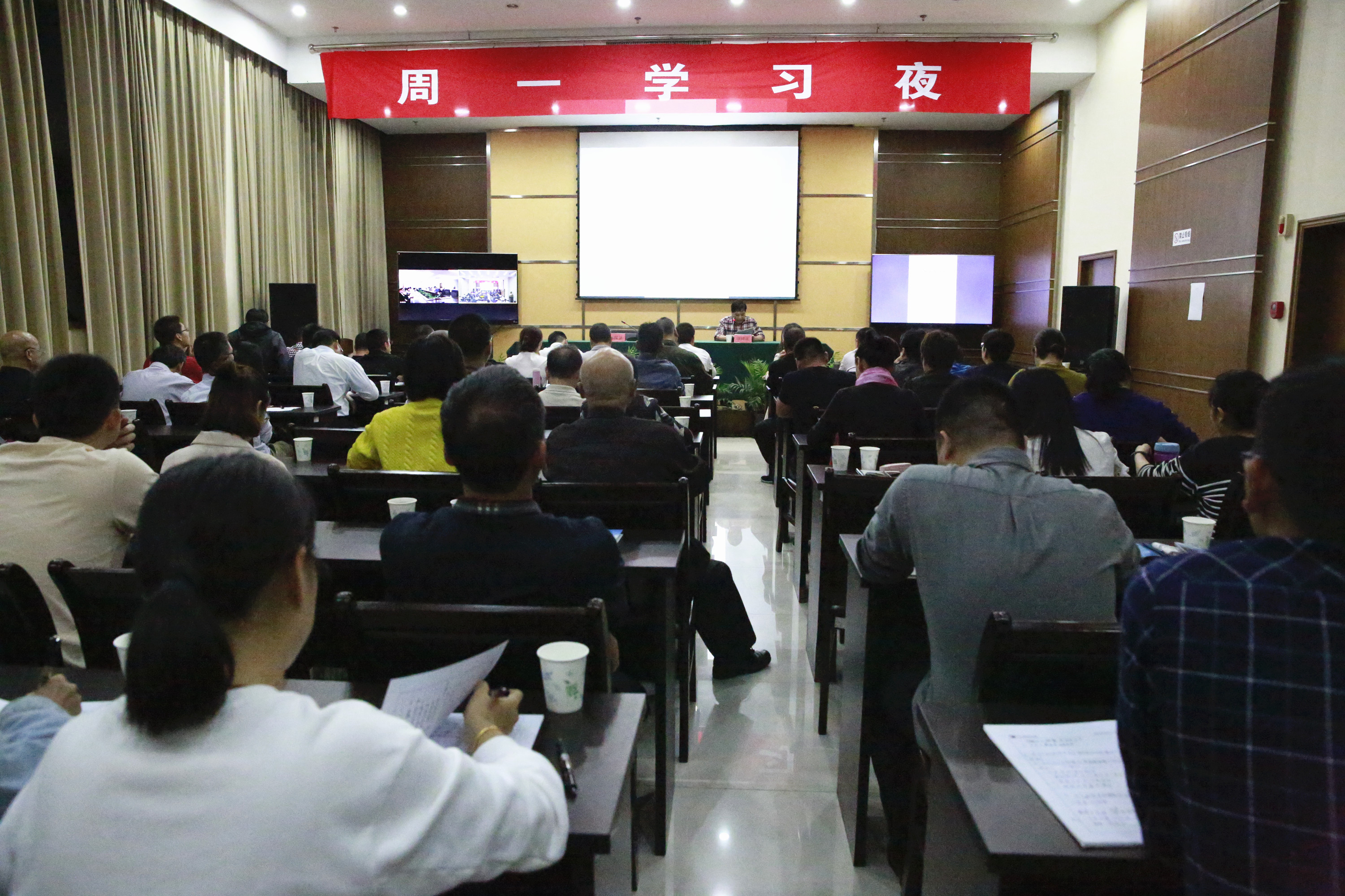 圖為參會人員 學習夜上,公司副總經理陳保衛組織學習了有關市紀委開展的整治“四風”專項行動文件,安全總監項同富傳達了市長張兵在安全生產委員會會議上的重要講話精神,工程養護部負責人在會上進行了公開檢討。公司全體經營班子和近百名干部職工還觀看了《時代楷模—黃大年先進事跡》紀錄片。