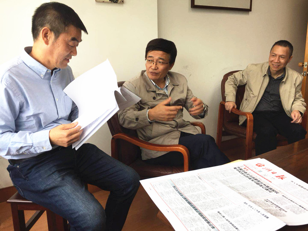 圖為市國資委主任徐豪和集團(tuán)總經(jīng)理張建平一起走訪市財政局股東單位