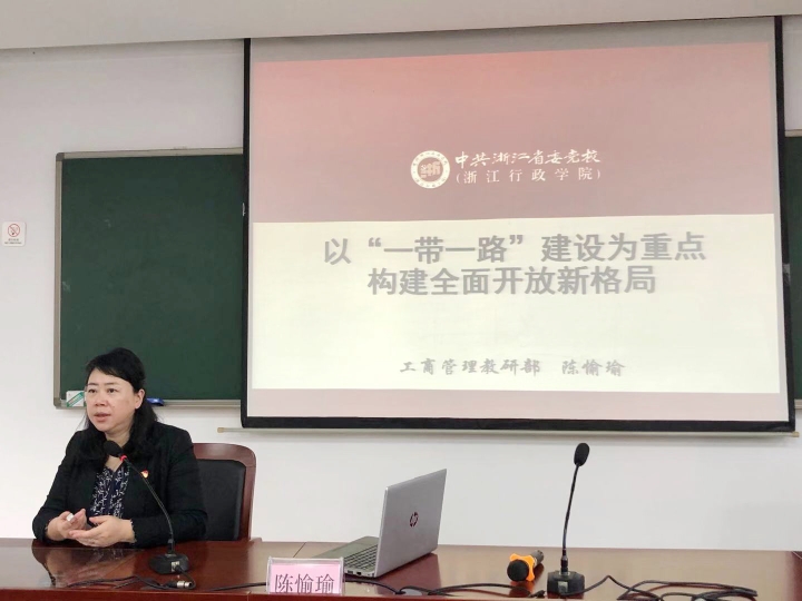 圖為省委黨校工商管理教研部副主任、教授陳愉瑜以《“一帶一路”與全面開(kāi)放》為題授課