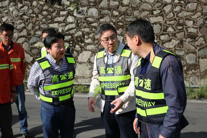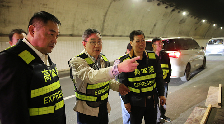 10月31日上午,臺(tái)州高速集團(tuán)董事長(zhǎng)陳文波在總工程師江輝的陪同下,趕赴甬臺(tái)溫高速公路溫州方向黃土嶺隧道、橋梁維修加固工程施工現(xiàn)場(chǎng),檢查施工進(jìn)展情況。