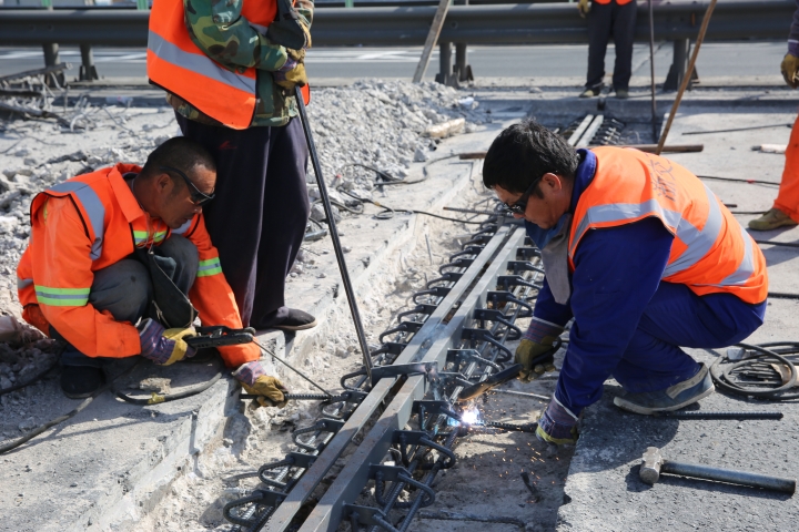 隨后,在伸縮縫型鋼安裝現(xiàn)場(chǎng),陳文波撿起鑿除的碎渣,查看被鑿除的舊伸縮縫情況。公司所轄路段屬于軟土路基,且有91座橋梁,由于運(yùn)行時(shí)間已20余年,部分橋梁伸縮縫破損較為嚴(yán)重,如何維修橋梁伸縮縫和橋頭跳一直是個(gè)老大難問題。在橋梁伸縮縫修補(bǔ)現(xiàn)場(chǎng),因?yàn)橹剀嚨哪雺海糠稚炜s縫已經(jīng)磨損嚴(yán)重,所在的混凝土路面只能借助鑿巖機(jī)進(jìn)行作業(yè)。
