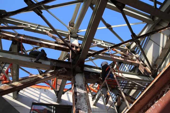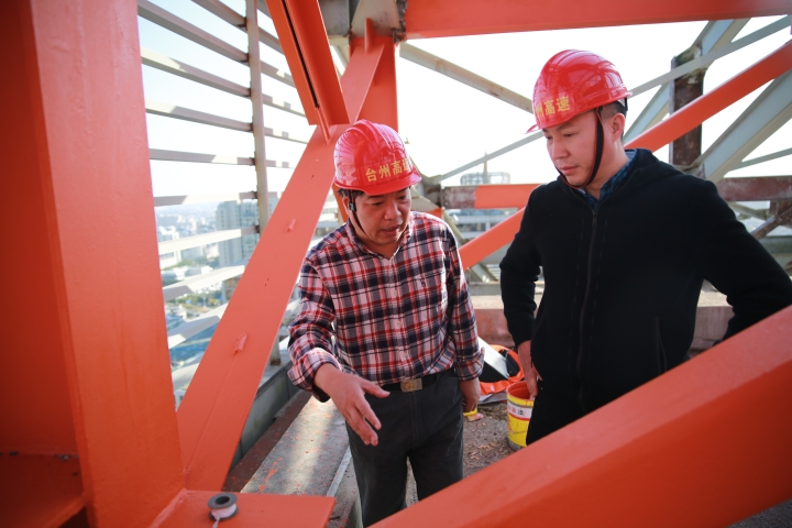 集團安全總監(jiān)項同富檢查天和大廈除銹施工 11月15日下午,集團安全總監(jiān)項同富在辦公室、房產公司相關人員的陪同下,到天和大廈樓頂鋼架除銹施工現場檢查施工進展和安全工作。 集團總部天和大廈樓頂鋼架跨度大,高低水平不一致,很難搭建大范圍的防護網及腳手架等施工輔助工具,也無法采用大型機械打磨除銹的方式除去表面的銹層,只能靠手工和電動角磨機除銹。施工人員常常進行高空作業(yè),安全隱患大。