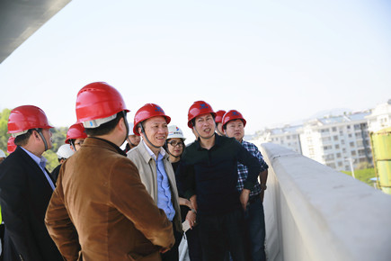 圖為公司總經(jīng)理張建平在8#立交橋上了解相關(guān)工程情況 張建平一行首先實(shí)地查看了內(nèi)環(huán)北路(江口段)項(xiàng)目工地,聽(tīng)取工程進(jìn)展情況匯報(bào)。在現(xiàn)場(chǎng),只見(jiàn)爆破量達(dá)到70%的安然山體已經(jīng)開(kāi)辟出一條可供工程車(chē)輛通行的大口子,耳邊不停地傳來(lái)機(jī)器忙碌作業(yè)的轟鳴聲。張建平一路由東向西穿行在施工便道上,看到施工區(qū)域一側(cè)各種安全防范設(shè)施有序排列,感受到沿途濃烈的施工氛圍,他對(duì)此表示滿(mǎn)意。 途徑內(nèi)環(huán)路8#立交項(xiàng)目工地時(shí),張建平沿著臨時(shí)搭設(shè)的通道,爬上8#立交橋,遠(yuǎn)眺8#立交放射線(xiàn)項(xiàng)目所在地,向有關(guān)人員了解該項(xiàng)目前期準(zhǔn)備工作情況。眼下,距離11月11日內(nèi)環(huán)路主線(xiàn)通車(chē)僅剩下近半年的時(shí)間,張建平強(qiáng)調(diào),各部門(mén)要努力抓好施工進(jìn)度,保證工程質(zhì)量,更要時(shí)刻將安全放在首位。 陳林偉