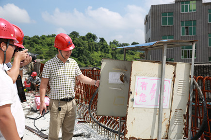 圖為檢查組檢查6#立交施工現(xiàn)場用電安全情況